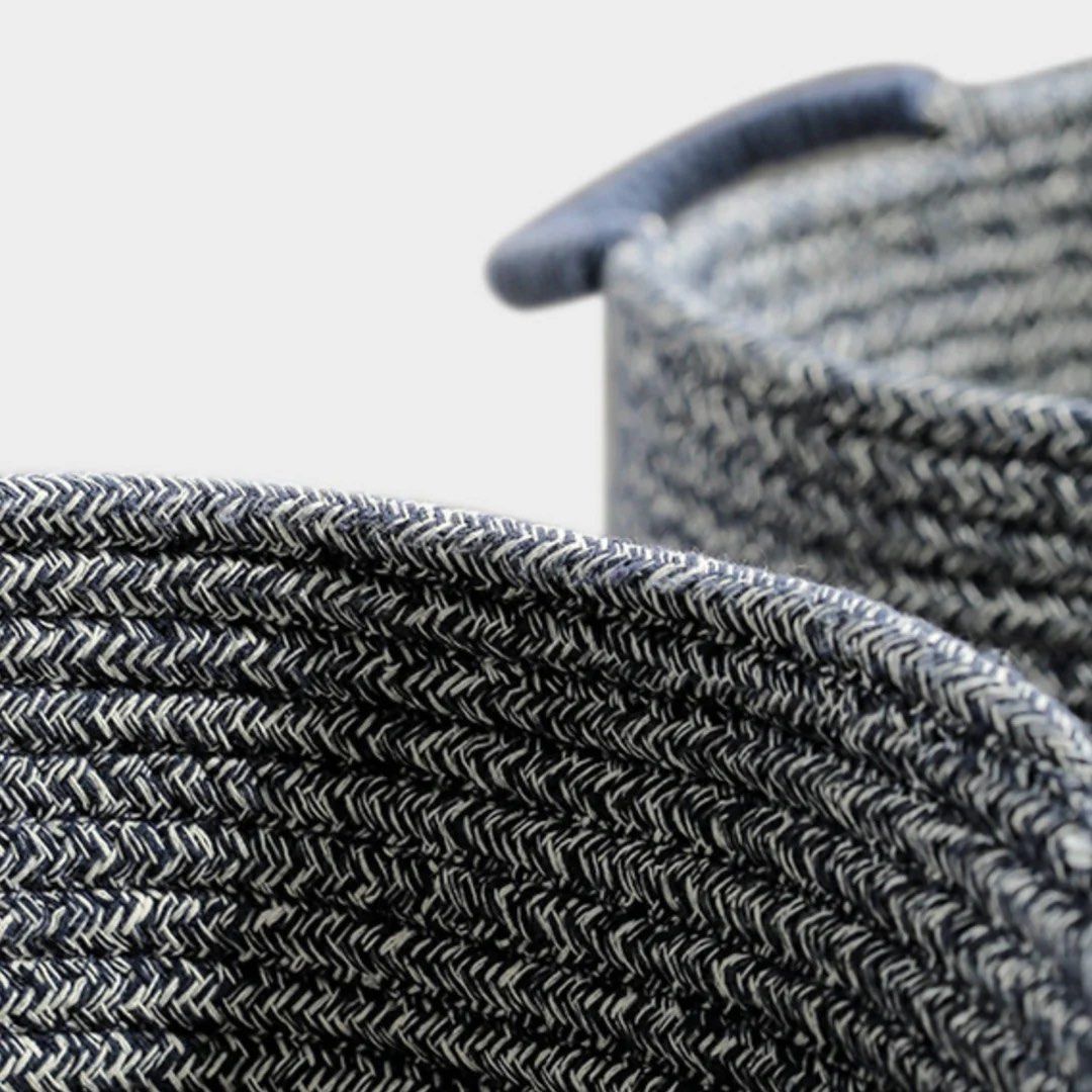 Made from a cotton blend in a ticking stripe, its braided construction adds stylish appeal to the design. Two side handles make it easy to transport from one room to another.
