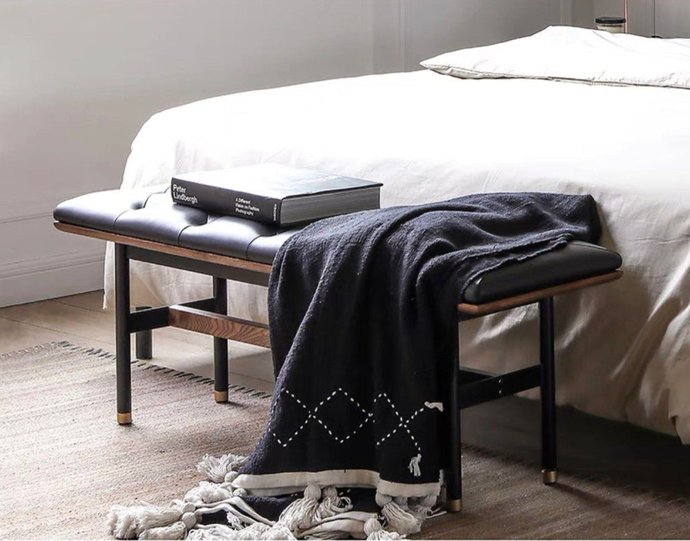 Our bench features a stylish and minimalist design, constructed using black walnut and adorned with a cushioned top grain leather seat. Supported by robust carbon steel legs with gold accents, this modern piece is sure to garner attention, whether placed in the hallway, dining area, or office.