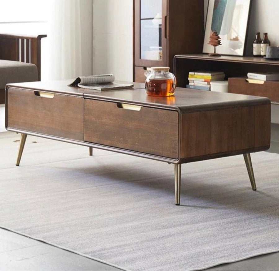 Give your living room a touch of mid-century modern style with this sleek coffee table. It features four splayed legs made of solid poplar wood in a warm brown finish that can easily match various color schemes. Two drawers provide hidden storage for your items, and the rectangular top provides ample space for displaying snacks, magazines, and more. Note: Assembly is needed.