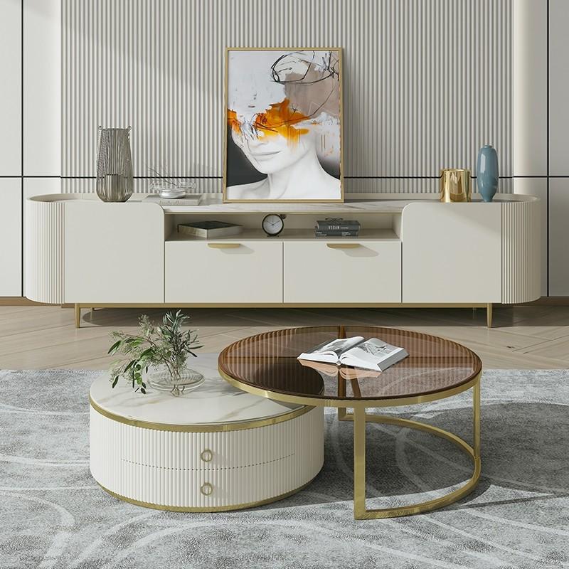 Looking for luxurious coffee table? CARINA modern luxury nesting table are a set of two gorgeous round table with a unique slate design / glass on top with a golden finish steel structure. CARINA is a powerhouse option loaded with versatility - with drawers and lets you hide the smaller table under the larger one and pull it out for more table space.